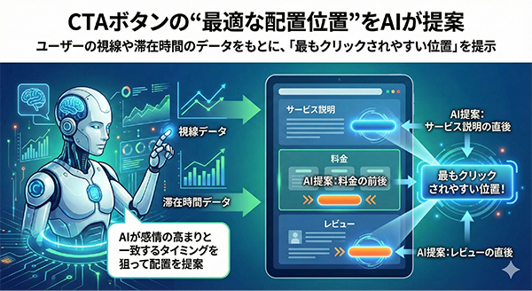 これまでは「とりあえず一番下」 or「なんとなく目立つ位置」に設置するという考え方でしたが、AIを導入することで、「最もクリックされやすい位置」を分析して配置を提案してくれます。