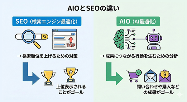 これはよく混同されることがありますが、SEOが「検索順位」を最適化するのに対し、AIOは“Web集客全体”をAIの力で最適化していくことをいいます。
