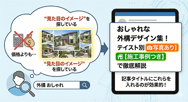 たとえば「外構 おしゃれ」で検索する人は、価格よりも“見た目のイメージ”を探している人と考えられます。
