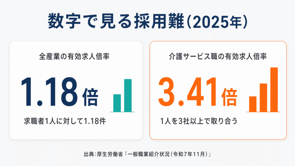 介護サービス職にいたっては3.41倍(2025年5月時点)と、1人を3社以上で取り合う競争になっています。