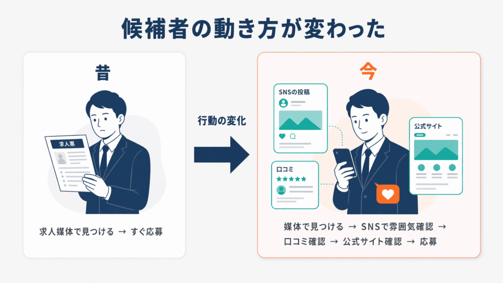 - 求人媒体だけで応募が集まらないのは、候補者の行動が「応募前に会社を知る」型に変わったから