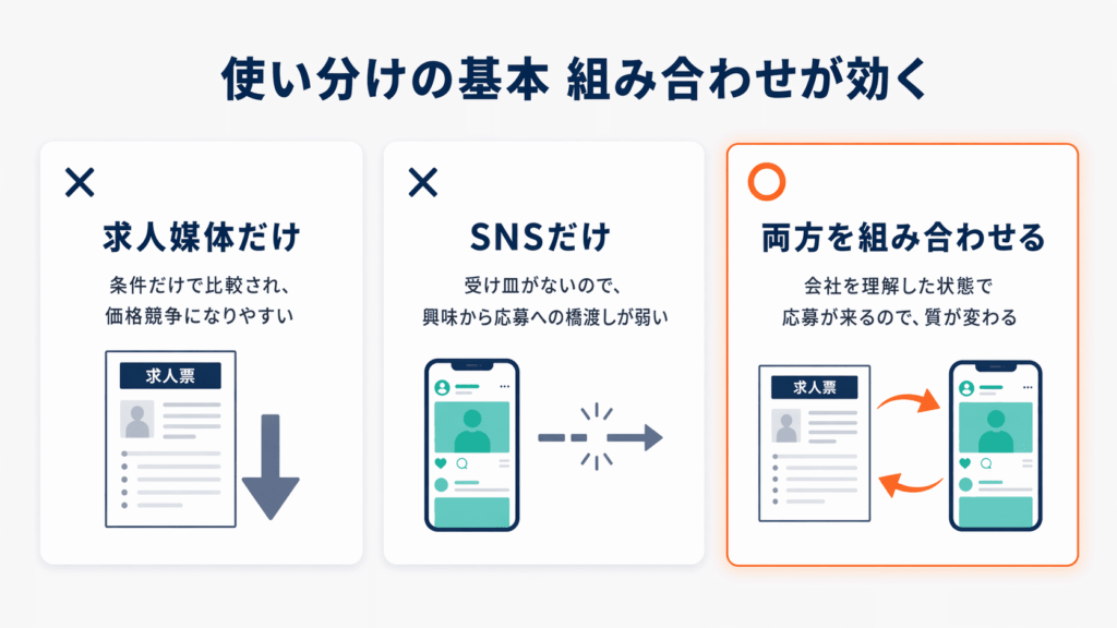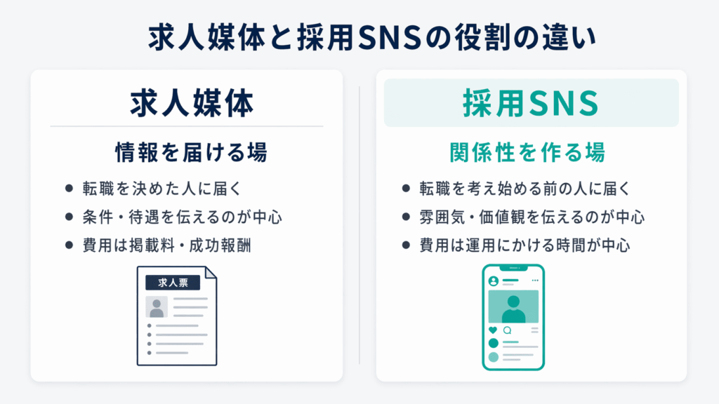 結論として、求人媒体は「情報を届ける場」、SNS採用は「関係性を作る場」です。
