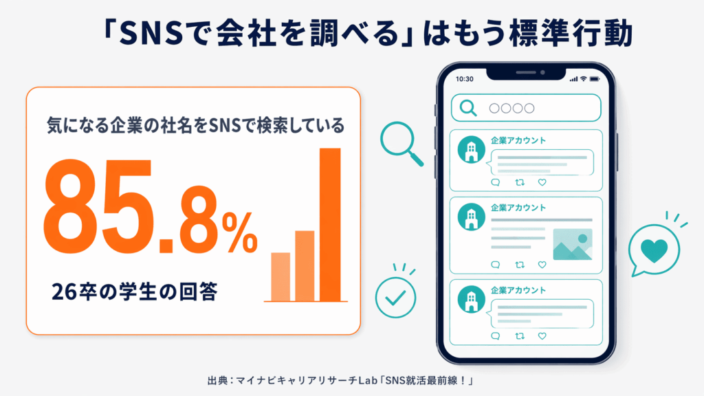 マイナビの調査によると、26卒の学生の85.8%が「気になる企業の社名をSNSで検索している」と回答しています。