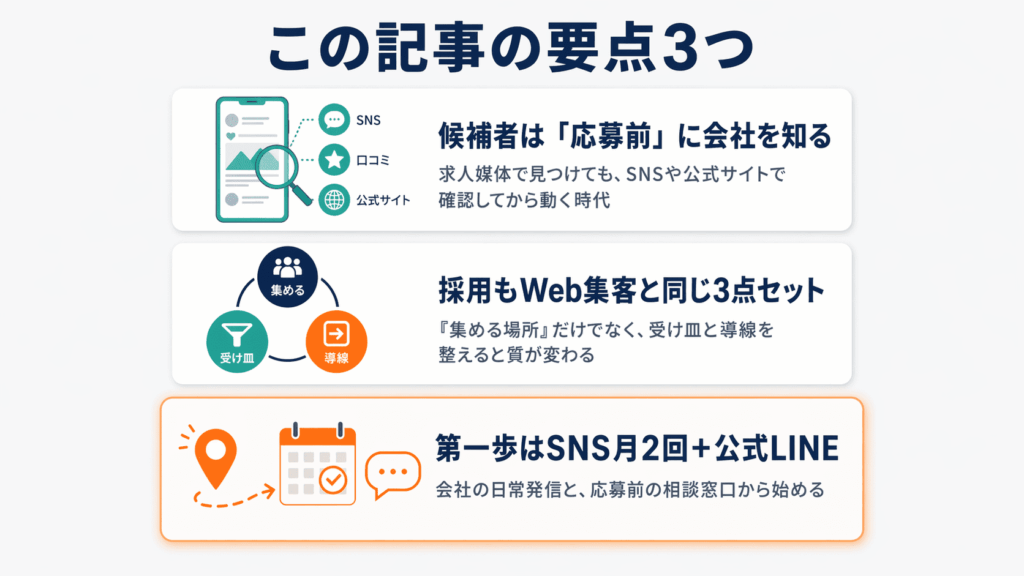 - まずは採用SNSで会社の日常発信を月2回から、応募前の相談窓口として公式LINEを用意するのが、現実的な第一歩