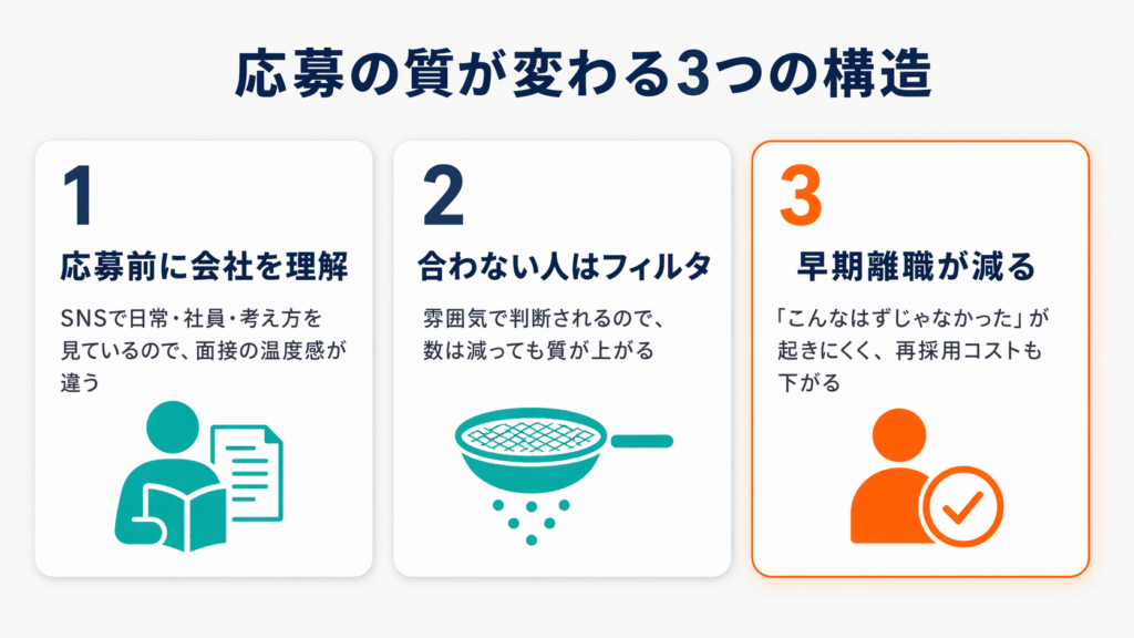 SNSで会社の日常・社員の声・考え方を発信し続けることで、応募者は「だいたいどんな会社か」を知った状態で応募してきます。
