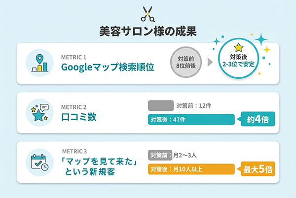 事例②:美容サロン様(MEO中心のWeb集客)