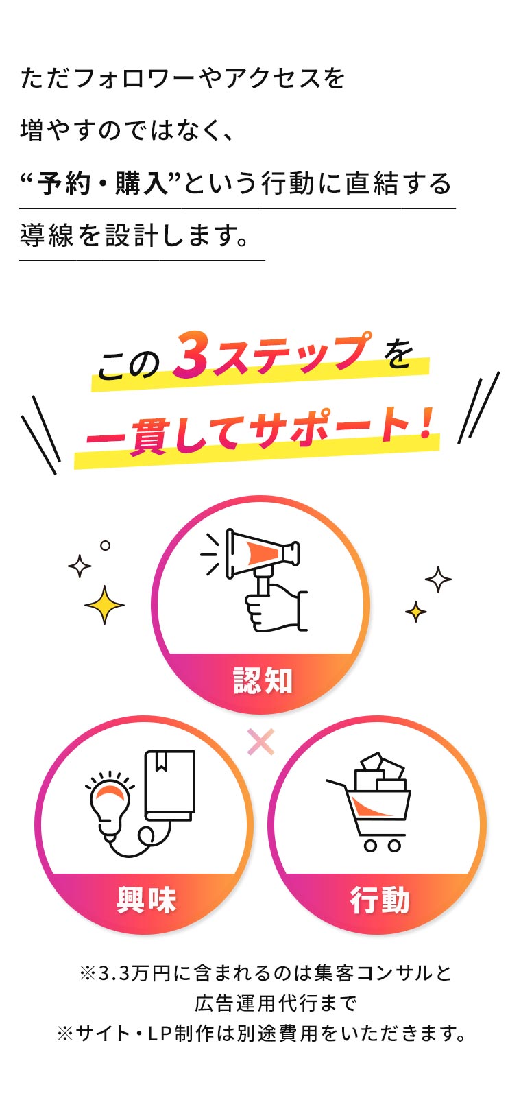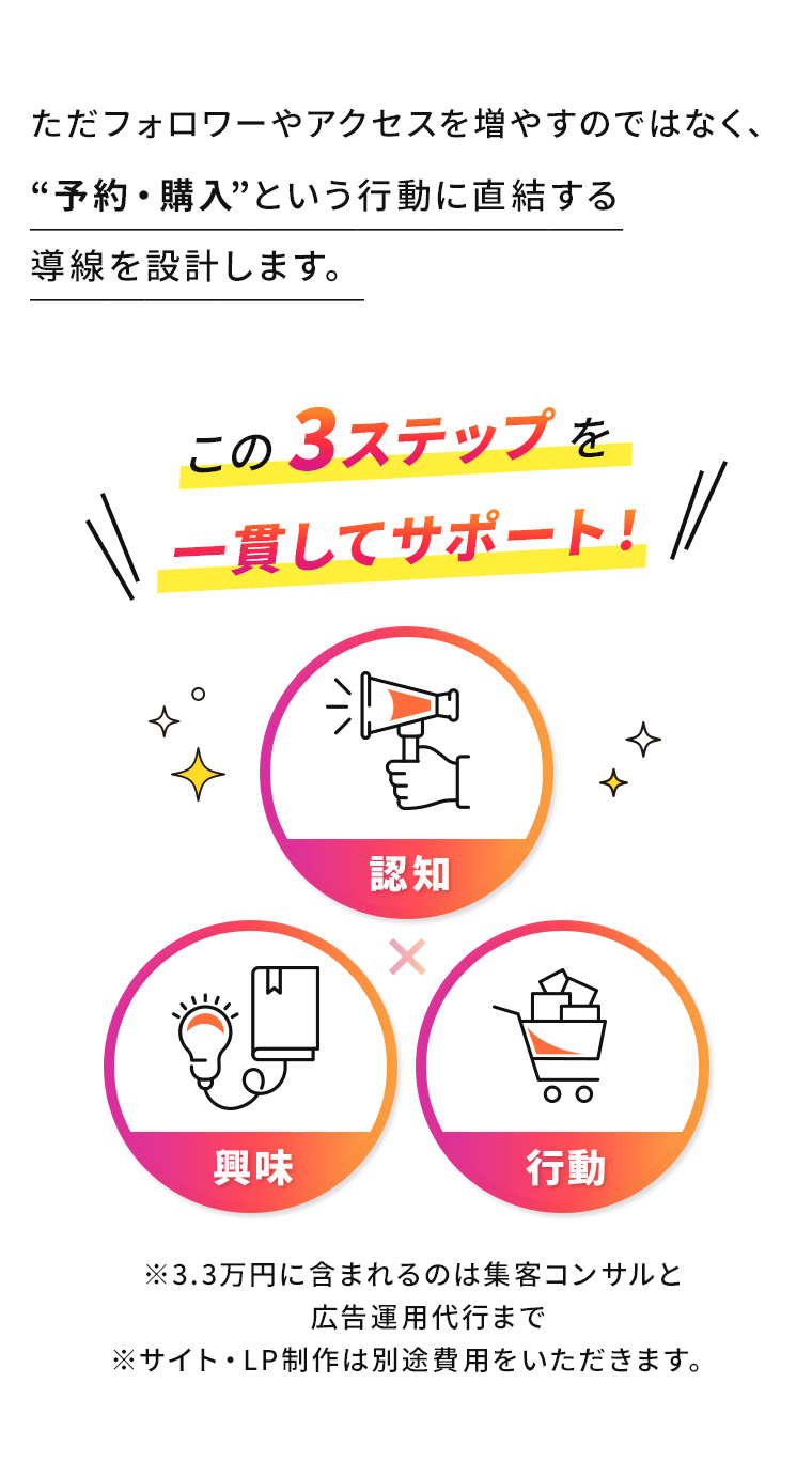 3.3万円で、初期設定、広告運用代行、レポーティング(月1回)までを行います。